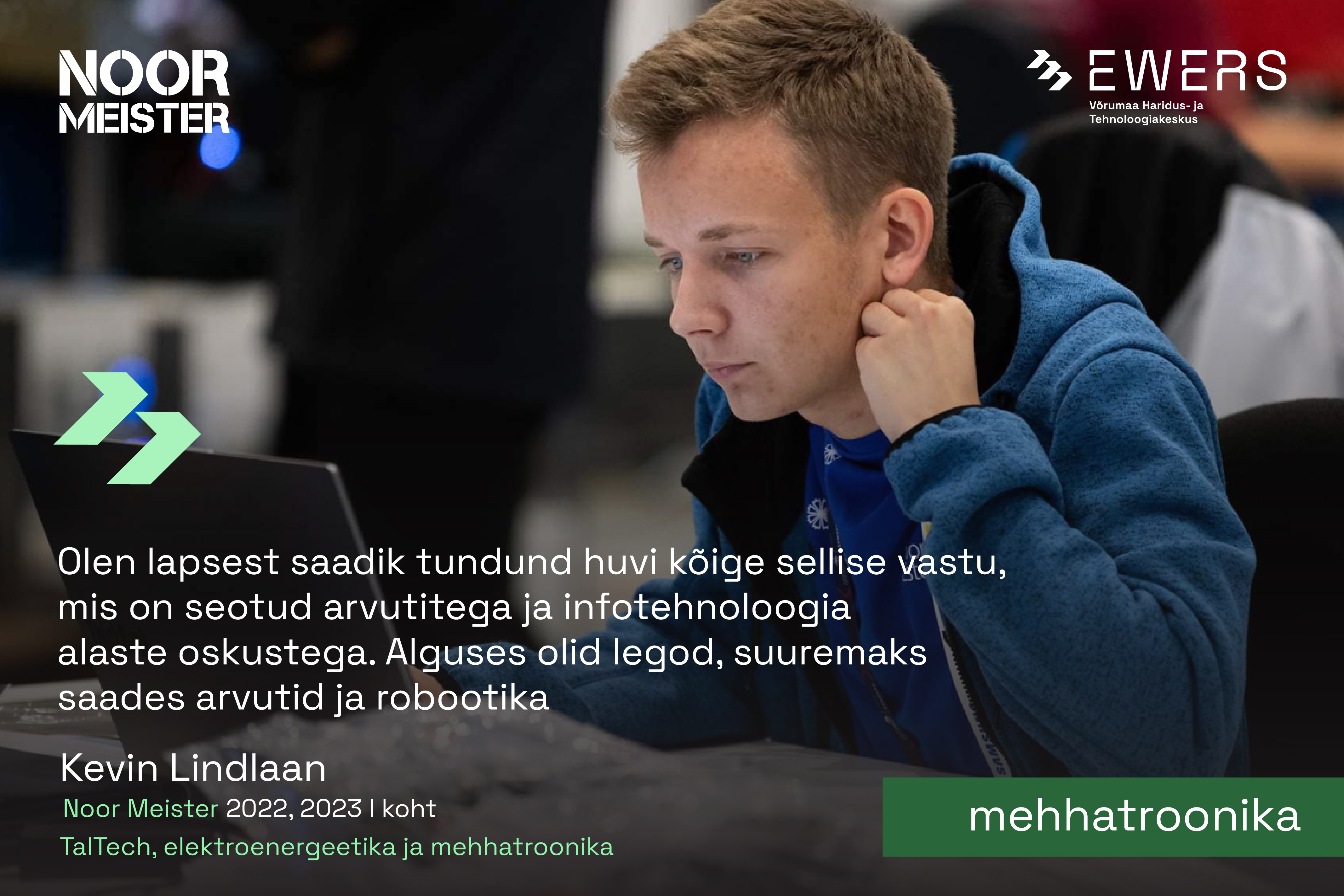 Kevin Lindlaan on EWERSi mehhatroonika eriala vilistlane. Peale EWERSi lõpetamist jätkas õpinguid TalTechi elektroenergeetika ja mehhatroonika erialal. Kevin esindas edukalt nii EWERSit kui ka Eestit mitmetel rahvusvahelistel kutsevõistlustel.